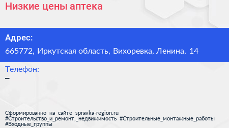 Низкие цены, аптека по адресу 665772, Иркутская область, Вихоревка, Ленина, 14 в дальнейшем Организация, размещена в следующих категориях:
