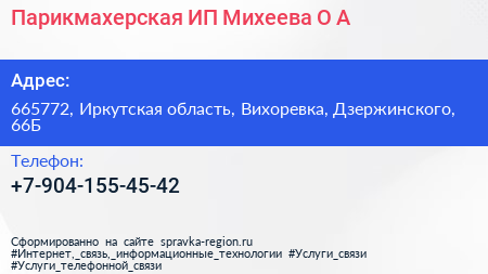 Парикмахерская, ИП Михеева О.А. по адресу 665772, Иркутская область, Вихоревка, Дзержинского, 66Б в дальнейшем Организация, размещена в следующих категориях: