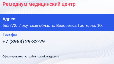 Ремедиум, медицинский центр по адресу 665772, Иркутская область, Вихоревка, Гастелло, 10а в дальнейшем Организация, размещена в следующих категориях: