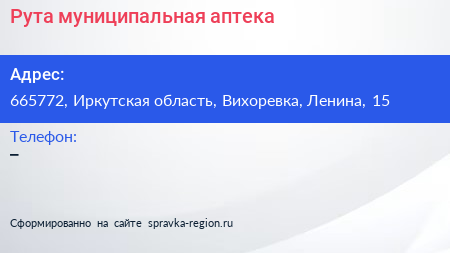 Рута, муниципальная аптека по адресу 665772, Иркутская область, Вихоревка, Ленина, 15 в дальнейшем Организация, размещена в следующих категориях: