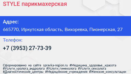 STYLE, парикмахерская по адресу 665770, Иркутская область, Вихоревка, Пионерская, 27 в дальнейшем Организация, размещена в следующих категориях: