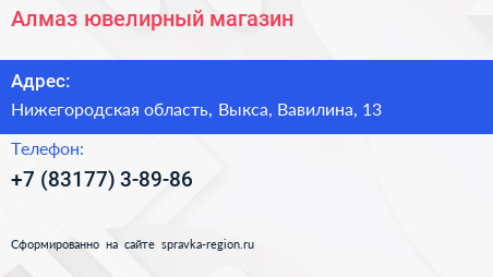Алмаз, ювелирный магазин по адресу Нижегородская область, Выкса, Вавилина, 13 в дальнейшем Организация, размещена в следующих категориях: