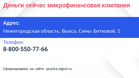 Деньги сейчас, микрофинансовая компания по адресу Нижегородская область, Выкса, Симы Битковой, 1 в дальнейшем Организация, размещена в следующих категориях: