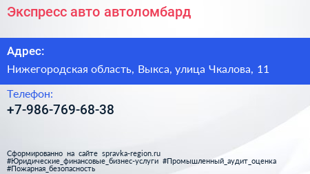 Экспресс-авто, автоломбард по адресу Нижегородская область, Выкса, улица Чкалова, 11 в дальнейшем Организация, размещена в следующих категориях: