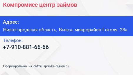 Компромисс, центр займов по адресу Нижегородская область, Выкса, микрорайон Гоголя, 28а в дальнейшем Организация, размещена в следующих категориях: