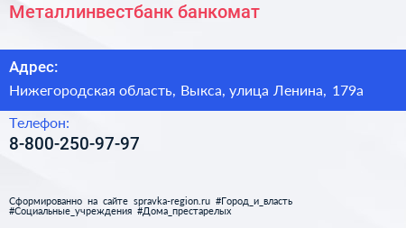Металлинвестбанк, банкомат по адресу Нижегородская область, Выкса, улица Ленина, 179а в дальнейшем Организация, размещена в следующих категориях: