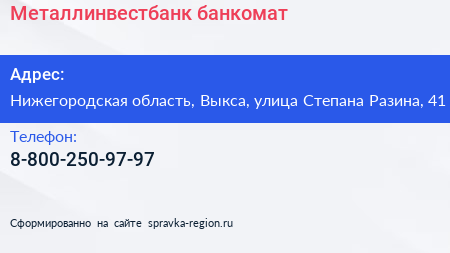 Металлинвестбанк, банкомат по адресу Нижегородская область, Выкса, улица Степана Разина, 41 в дальнейшем Организация, размещена в следующих категориях:
