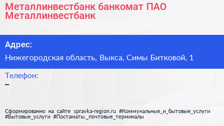 Металлинвестбанк, банкомат, ПАО Металлинвестбанк по адресу Нижегородская область, Выкса, Симы Битковой, 1 в дальнейшем Организация, размещена в следующих категориях: