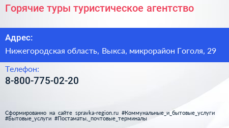 Горячие туры, туристическое агентство по адресу Нижегородская область, Выкса, микрорайон Гоголя, 29 в дальнейшем Организация, размещена в следующих категориях: