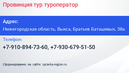 Провинция-тур, туроператор по адресу Нижегородская область, Выкса, Братьев Баташевых, 38а в дальнейшем Организация, размещена в следующих категориях: