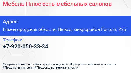Мебель Плюс, сеть мебельных салонов по адресу Нижегородская область, Выкса, микрорайон Гоголя, 29Б в дальнейшем Организация, размещена в следующих категориях: