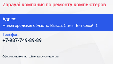 Zapayai, компания по ремонту компьютеров по адресу Нижегородская область, Выкса, Симы Битковой, 1 в дальнейшем Организация, размещена в следующих категориях: