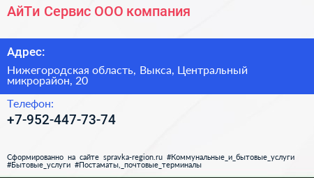 АйТи Сервис, ООО, компания по адресу Нижегородская область, Выкса, Центральный микрорайон, 20 в дальнейшем Организация, размещена в следующих категориях: