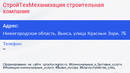 СтройТехМеханизация, строительная компания по адресу Нижегородская область, Выкса, улица Красные Зори, 7Б в дальнейшем Организация, размещена в следующих категориях: