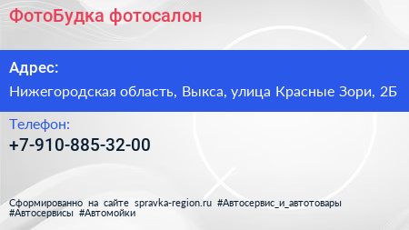 ФотоБудка, фотосалон по адресу Нижегородская область, Выкса, улица Красные Зори, 2Б в дальнейшем Организация, размещена в следующих категориях: