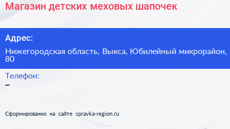 Магазин детских меховых шапочек по адресу Нижегородская область, Выкса, Юбилейный микрорайон, 80 в дальнейшем Организация, размещена в следующих категориях: