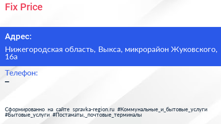 Fix Price по адресу Нижегородская область, Выкса, микрорайон Жуковского, 16а в дальнейшем Организация, размещена в следующих категориях: