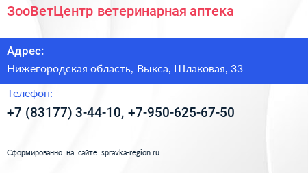 ЗооВетЦентр, ветеринарная аптека по адресу Нижегородская область, Выкса, Шлаковая, 33 в дальнейшем Организация, размещена в следующих категориях: