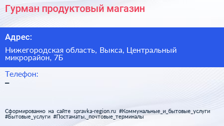 Гурман, продуктовый магазин по адресу Нижегородская область, Выкса, Центральный микрорайон, 7Б в дальнейшем Организация, размещена в следующих категориях: