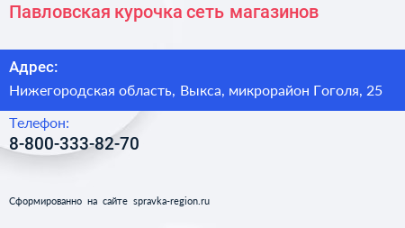 Павловская курочка, сеть магазинов по адресу Нижегородская область, Выкса, микрорайон Гоголя, 25 в дальнейшем Организация, размещена в следующих категориях: