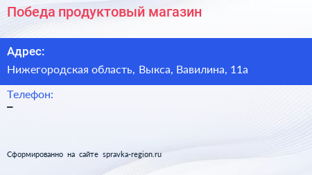 Победа, продуктовый магазин по адресу Нижегородская область, Выкса, Вавилина, 11а в дальнейшем Организация, размещена в следующих категориях: