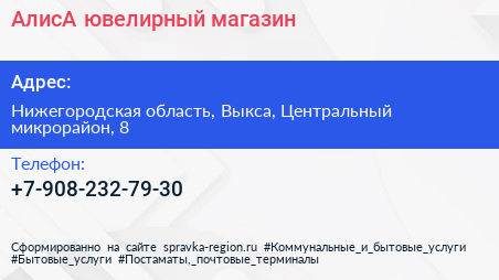 АлисА, ювелирный магазин по адресу Нижегородская область, Выкса, Центральный микрорайон, 8 в дальнейшем Организация, размещена в следующих категориях: