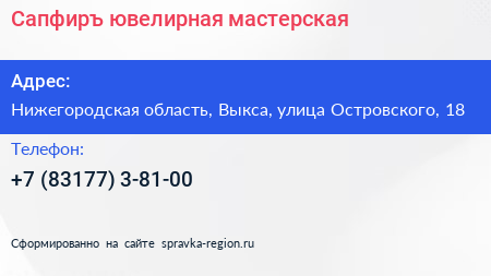 Сапфиръ, ювелирная мастерская по адресу Нижегородская область, Выкса, улица Островского, 18 в дальнейшем Организация, размещена в следующих категориях: