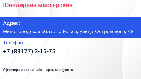 Ювелирная мастерская по адресу Нижегородская область, Выкса, улица Островского, 48 в дальнейшем Организация, размещена в следующих категориях: