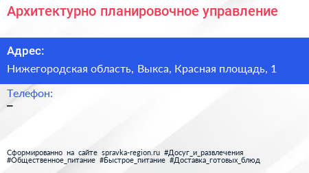 Архитектурно-планировочное управление по адресу Нижегородская область, Выкса, Красная площадь, 1 в дальнейшем Организация, размещена в следующих категориях: