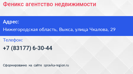 Феникс, агентство недвижимости по адресу Нижегородская область, Выкса, улица Чкалова, 29 в дальнейшем Организация, размещена в следующих категориях: