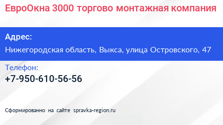 ЕвроОкна 3000, торгово-монтажная компания по адресу Нижегородская область, Выкса, улица Островского, 47 в дальнейшем Организация, размещена в следующих категориях: