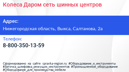Колеса Даром, сеть шинных центров по адресу Нижегородская область, Выкса, Салтанова, 2а в дальнейшем Организация, размещена в следующих категориях: