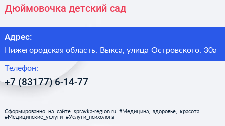 Дюймовочка, детский сад по адресу Нижегородская область, Выкса, улица Островского, 30а в дальнейшем Организация, размещена в следующих категориях: