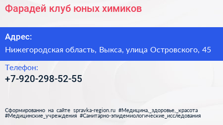 Фарадей, клуб юных химиков по адресу Нижегородская область, Выкса, улица Островского, 45 в дальнейшем Организация, размещена в следующих категориях: