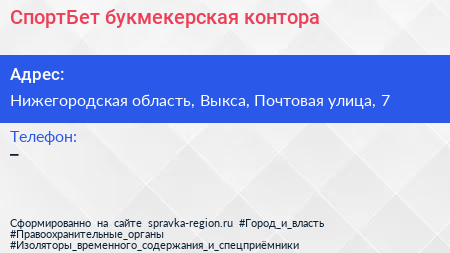 СпортБет, букмекерская контора по адресу Нижегородская область, Выкса, Почтовая улица, 7 в дальнейшем Организация, размещена в следующих категориях:
