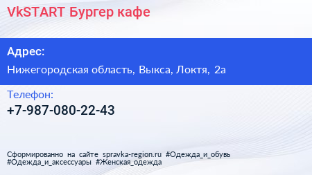 VkSTART Бургер, кафе по адресу Нижегородская область, Выкса, Локтя, 2а в дальнейшем Организация, размещена в следующих категориях: