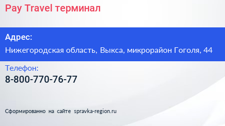 Pay.Travel, терминал по адресу Нижегородская область, Выкса, микрорайон Гоголя, 44 в дальнейшем Организация, размещена в следующих категориях: