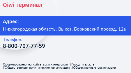 Qiwi, терминал по адресу Нижегородская область, Выкса, Борковский проезд, 12а в дальнейшем Организация, размещена в следующих категориях:
