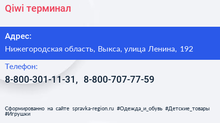 Qiwi, терминал по адресу Нижегородская область, Выкса, улица Ленина, 192 в дальнейшем Организация, размещена в следующих категориях: