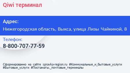 Qiwi, терминал по адресу Нижегородская область, Выкса, улица Лизы Чайкиной, 8 в дальнейшем Организация, размещена в следующих категориях: