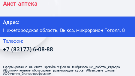 Аист, аптека по адресу Нижегородская область, Выкса, микрорайон Гоголя, 8 в дальнейшем Организация, размещена в следующих категориях: