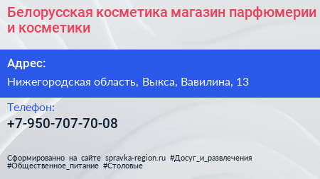Белорусская косметика, магазин парфюмерии и косметики по адресу Нижегородская область, Выкса, Вавилина, 13 в дальнейшем Организация, размещена в следующих категориях: