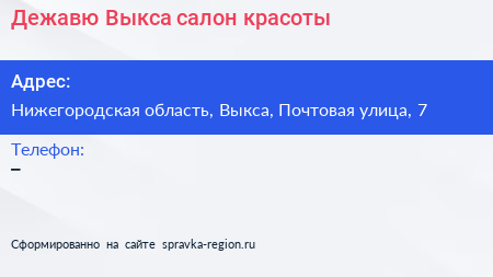 Дежавю Выкса, салон красоты по адресу Нижегородская область, Выкса, Почтовая улица, 7 в дальнейшем Организация, размещена в следующих категориях: