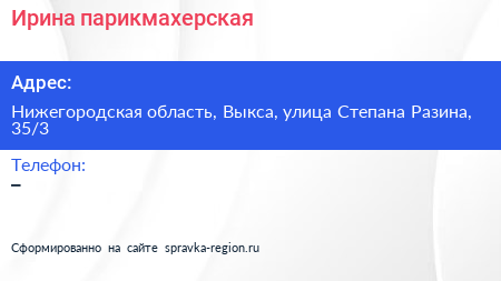 Ирина, парикмахерская по адресу Нижегородская область, Выкса, улица Степана Разина, 35/3 в дальнейшем Организация, размещена в следующих категориях: