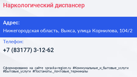 Наркологический диспансер по адресу Нижегородская область, Выкса, улица Корнилова, 104/2 в дальнейшем Организация, размещена в следующих категориях: