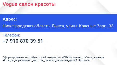 Vogue, салон красоты по адресу Нижегородская область, Выкса, улица Красные Зори, 33 в дальнейшем Организация, размещена в следующих категориях: