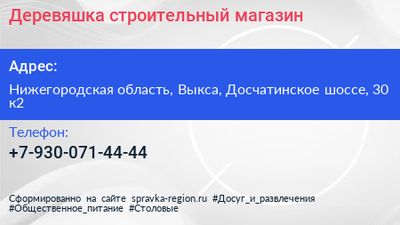 Деревяшка, строительный магазин по адресу Нижегородская область, Выкса, Досчатинское шоссе, 30 к2 в дальнейшем Организация, размещена в следующих категориях: