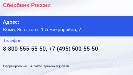 Сбербанк России по адресу Коми, Выльгорт, 1-й микрорайон, 7 в дальнейшем Организация, размещена в следующих категориях: