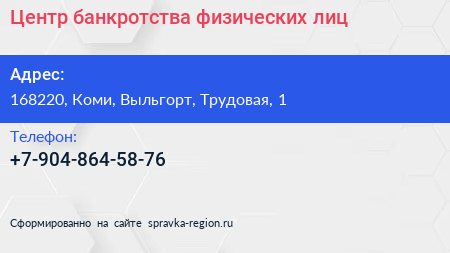 Центр банкротства физических лиц по адресу 168220, Коми, Выльгорт, Трудовая, 1 в дальнейшем Организация, размещена в следующих категориях: