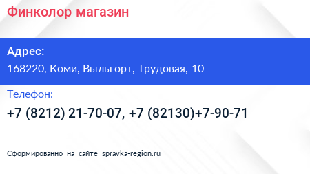 Финколор, магазин по адресу 168220, Коми, Выльгорт, Трудовая, 10 в дальнейшем Организация, размещена в следующих категориях: